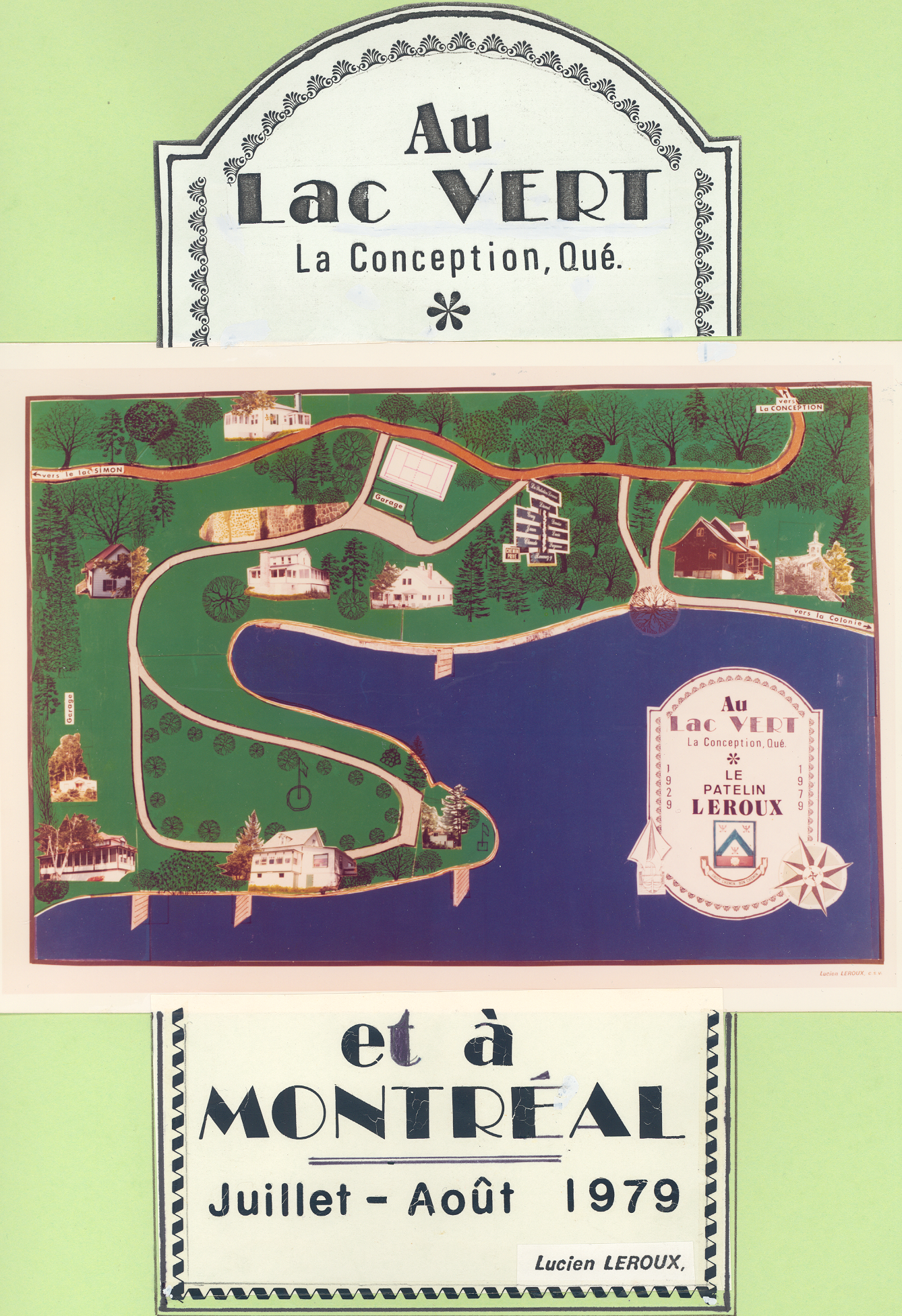Affiche provenant de l'album personnel de M. Leroux présentant une carte d'aménagement du Patelin Leroux, de même que les armoieries et la devise de la famille Leroux.