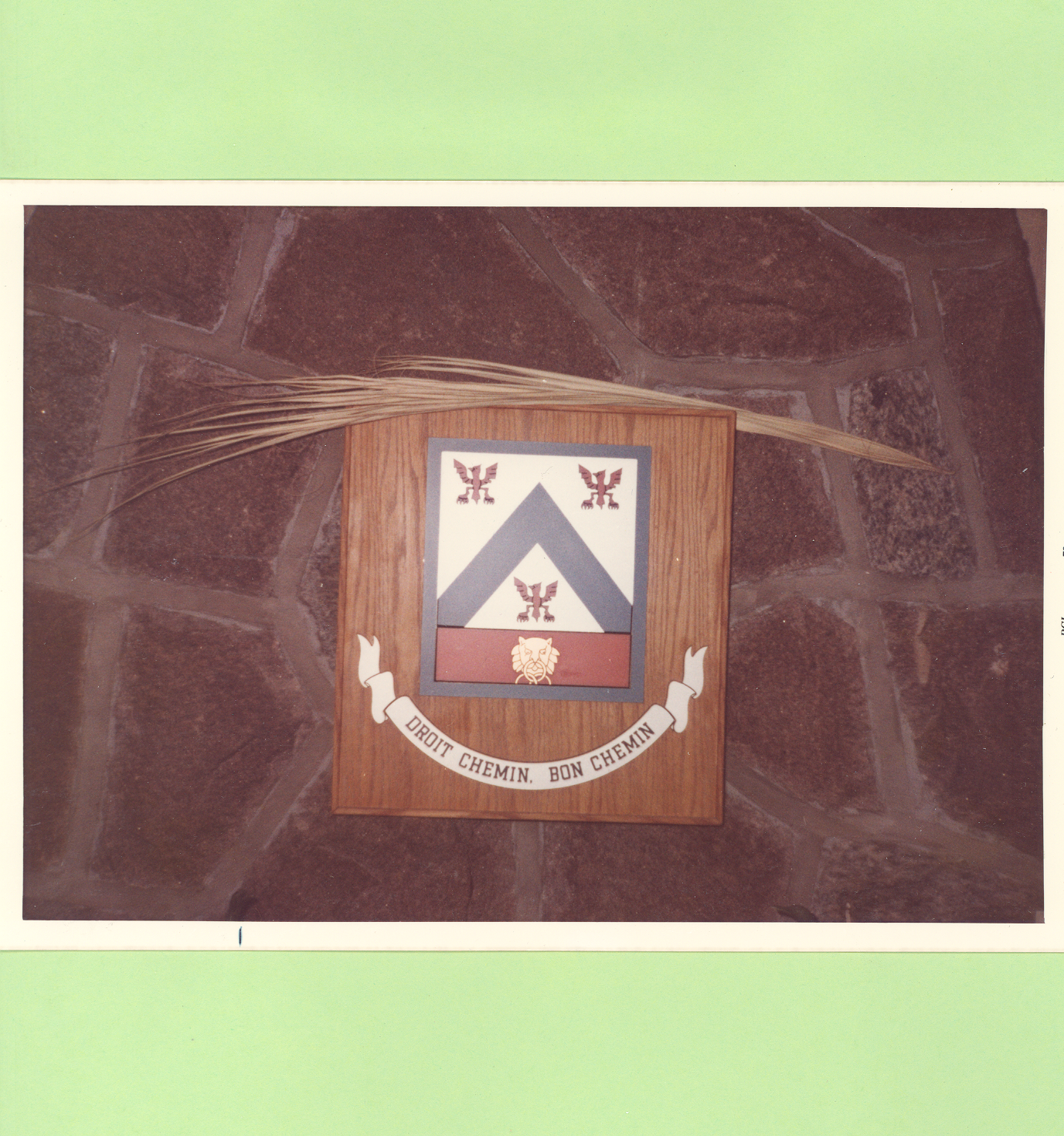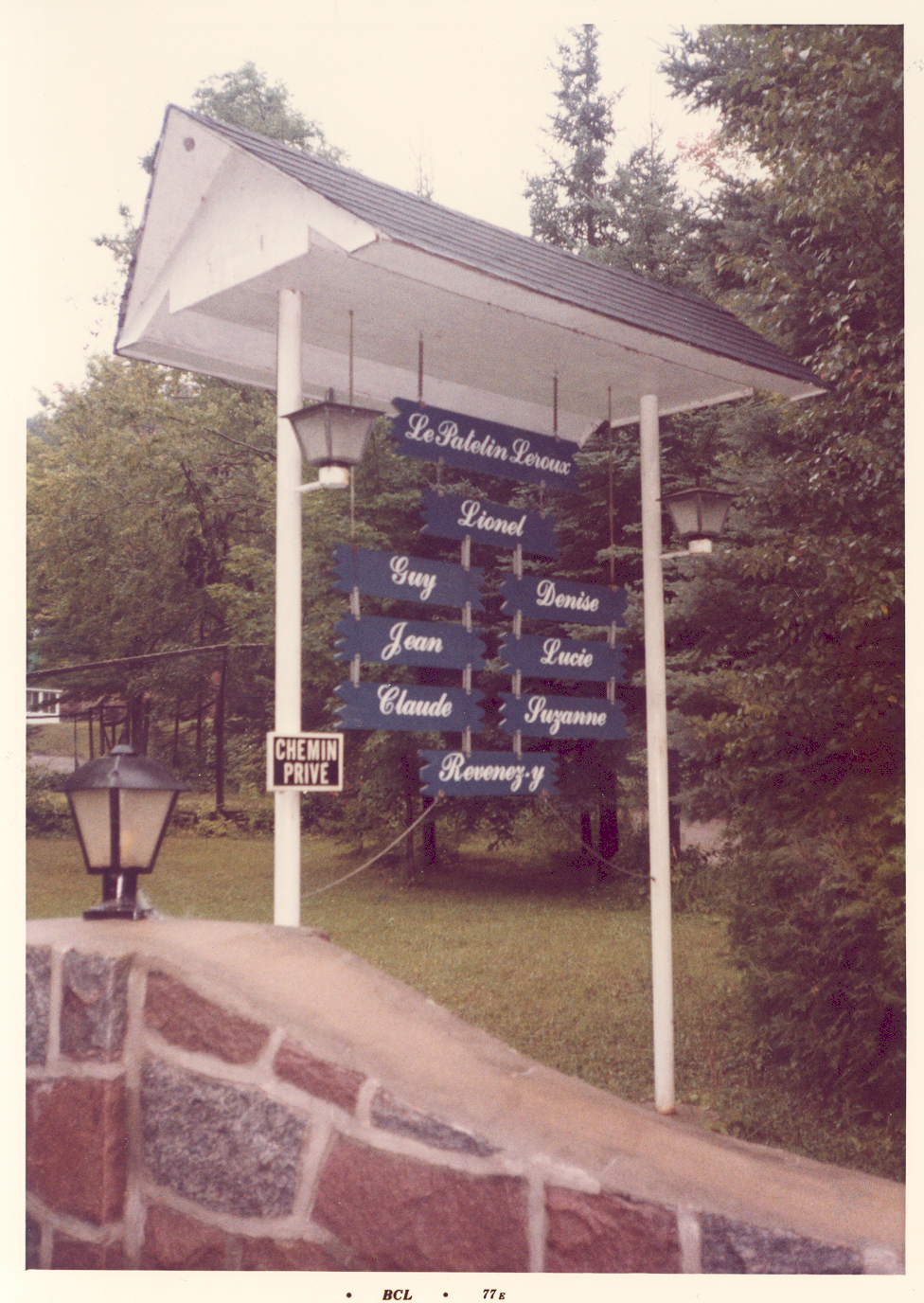 Affiche provenant de l'album personnel de M. Leroux présentant une carte d'aménagement du Patelin Leroux, de même que les armoieries et la devise de la famille Leroux.